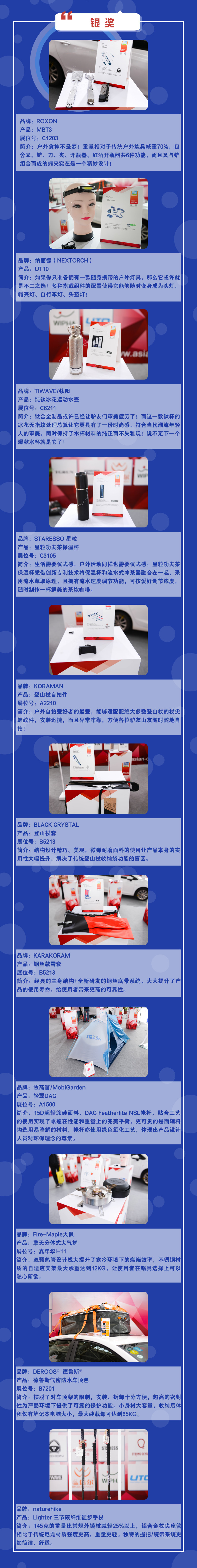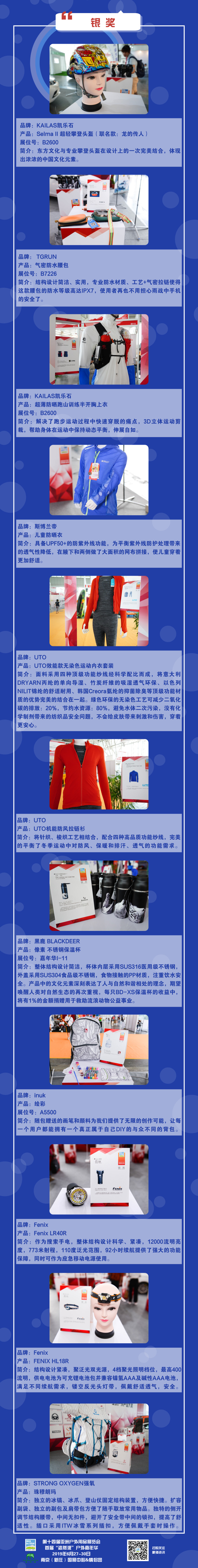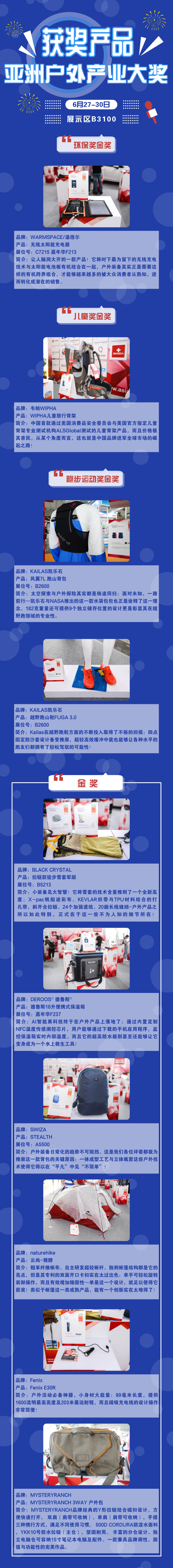 本次参与亚洲户外产业大奖评选的产品包含:服装、鞋类、背包、登山装备、跑步运动、配件及工具及野营用品等多种品类,几乎涵盖了当下户外领域最全面和最流行的运动项目。经过激烈角逐,在本次参赛的产品中共产生32件获奖产品。其中6个金奖、1个环保奖金奖、1个儿童奖金奖、2个跑步运动奖金奖、22个银奖。