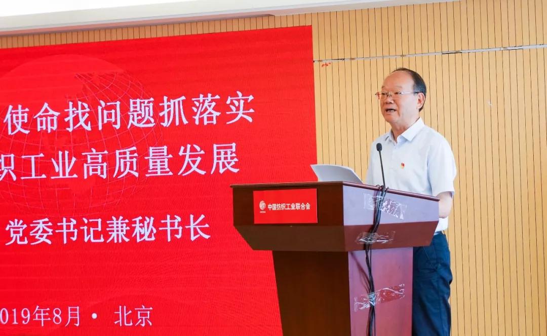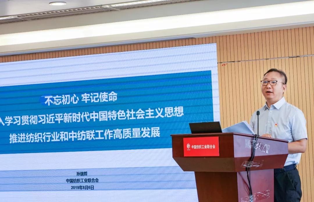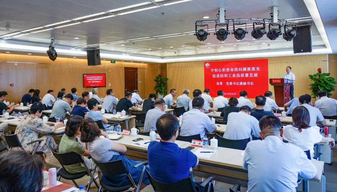 | 中纺联召开2019年年中工作会议暨“不忘初心 牢记使命”主题教育专题党课(附高勇、孙瑞哲讲话) | | 作者:中国纺织 时间:2019-08-06 评论(0) | | 8月6日,中国纺织工业联合会2019年年中工作会议暨“不忘初心、牢记使命”主题教育专题党课召开。 中国纺织工业联合会党委书记兼秘书长高勇、会长孙瑞哲,原会长杜钰洲、王天凯,副会长杨纪朝、夏令敏,党委副书记兼常务副秘书长陈伟康,纪委书记王久新,副会长徐迎新、陈大鹏、李陵申、端小平、杨兆华、孙淮滨;国资委协会党建局人事处处长、国资委行业协会主题教育指导一组成员毛金锋;以及中纺联各部门、各成员单位领导班子成员、中纺联党委直属22个基层党组织班子成员,各单位处/部门以上负责人参加了本次会议。陈伟康主持会议。