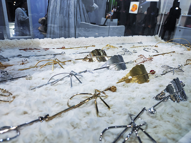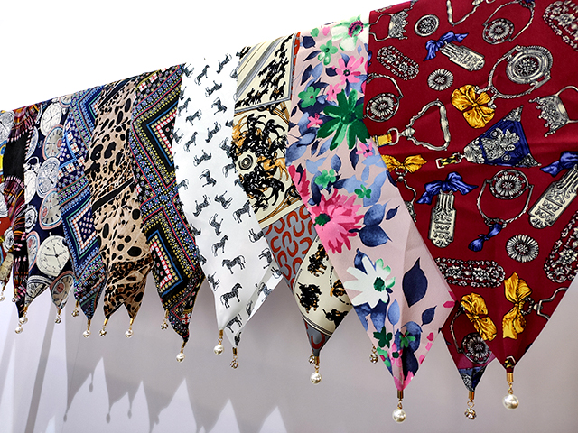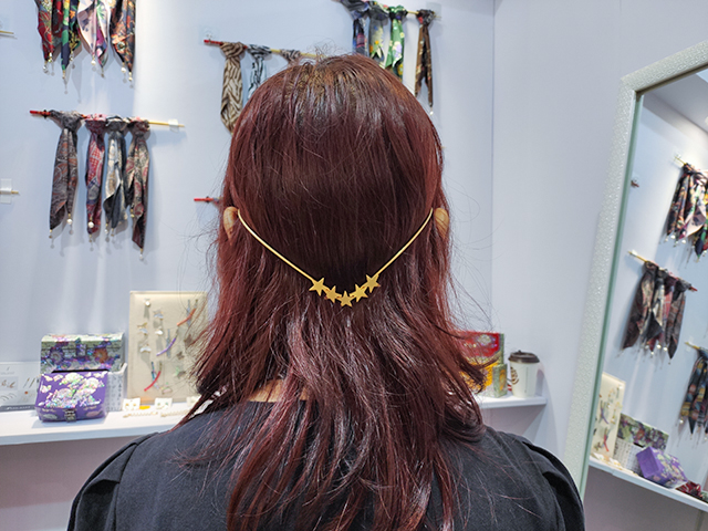 Jincceil是一家以丝巾、头饰为主的配饰品牌,本次参展因其花式特殊的丝巾、申请专利的头饰而广受关注。据创始人柳珍女士介绍,品牌创立于2013年,专注于丝巾和发饰、耳饰的原创设计。其中丝巾有别于市场上的大多数产品,形态十分特别,偏于细长、小巧,且尾端悬垂有珍珠、人工钻等装饰,花纹时尚,有设计感,可随季节随意变换,并具有较高的性价比;发饰则以传统功能结合现代工艺,头部后戴的款式目前在亚洲市场属于首创。