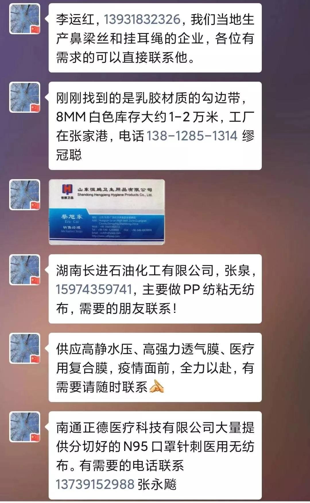 欣龙控股集团子公司宜昌欣龙卫材专业生产纯棉水刺布(医用酒精棉片材料、消毒湿巾)、聚丙烯熔喷布(口罩滤纸),需要的厂家可以联系:熊旭,联系电话15327633223微信同号