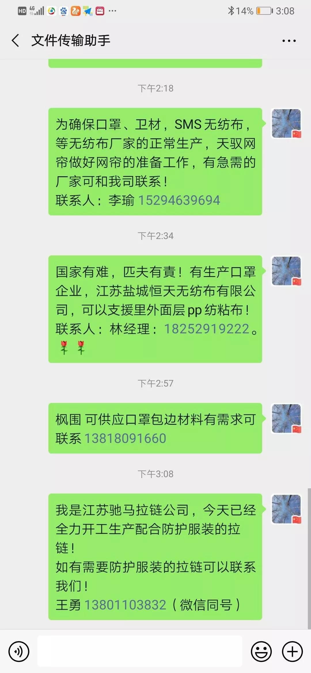 我是江苏驰马拉链公司,今天已经全力开工生产配合防护服装的拉链!王勇13801103832(微信同号)
