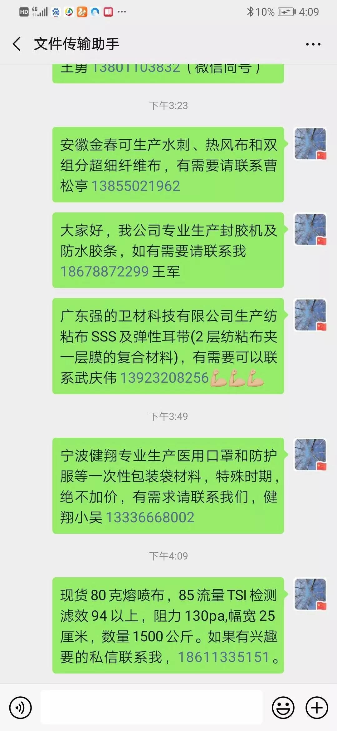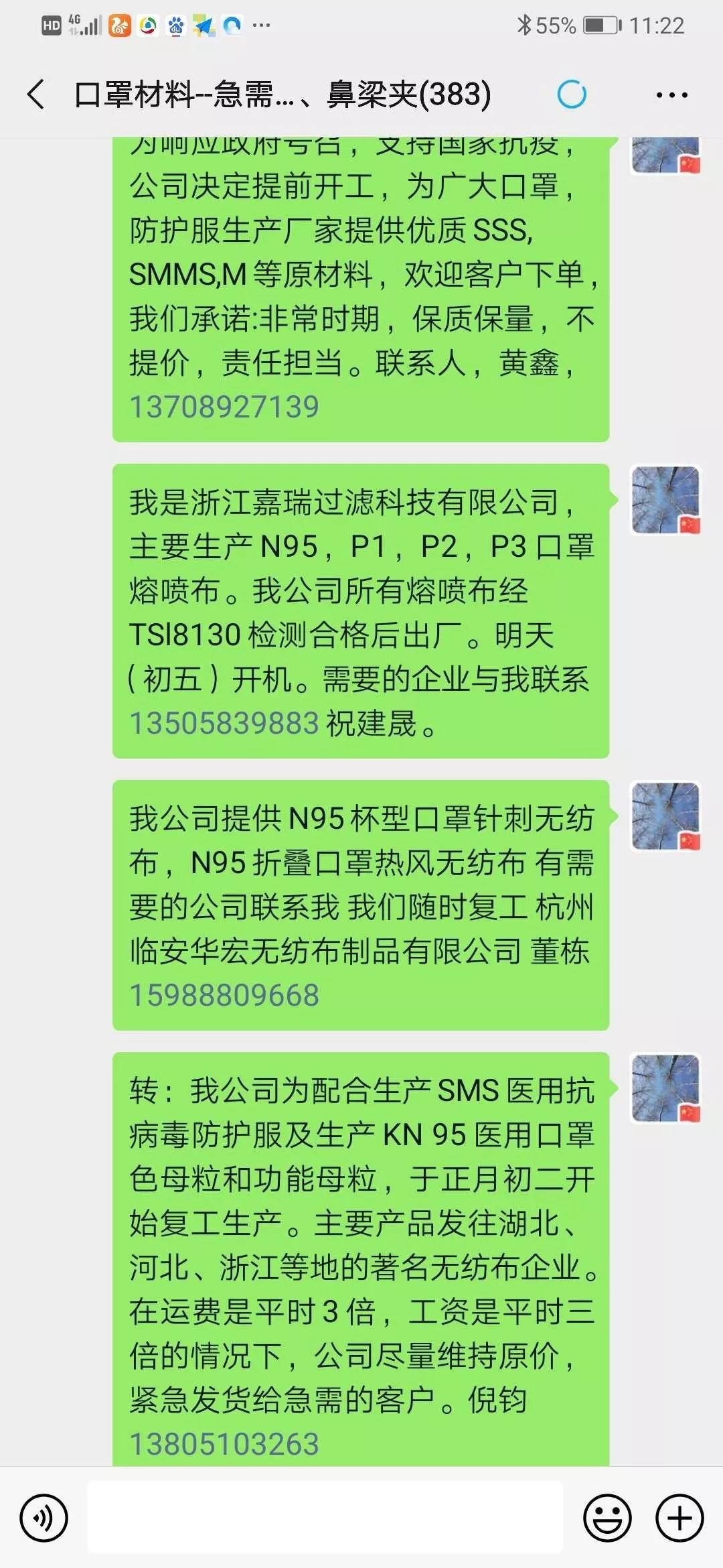 为响应政府号召,支持国家抗疫,公司决定提前开工,为广大口罩,防护服生产厂家提供优质SSS,SMMS,M等原材料,欢迎客户下单,我们承诺:非常时期,保质保量,不提价,责任担当。联系人,黄鑫,13708927139