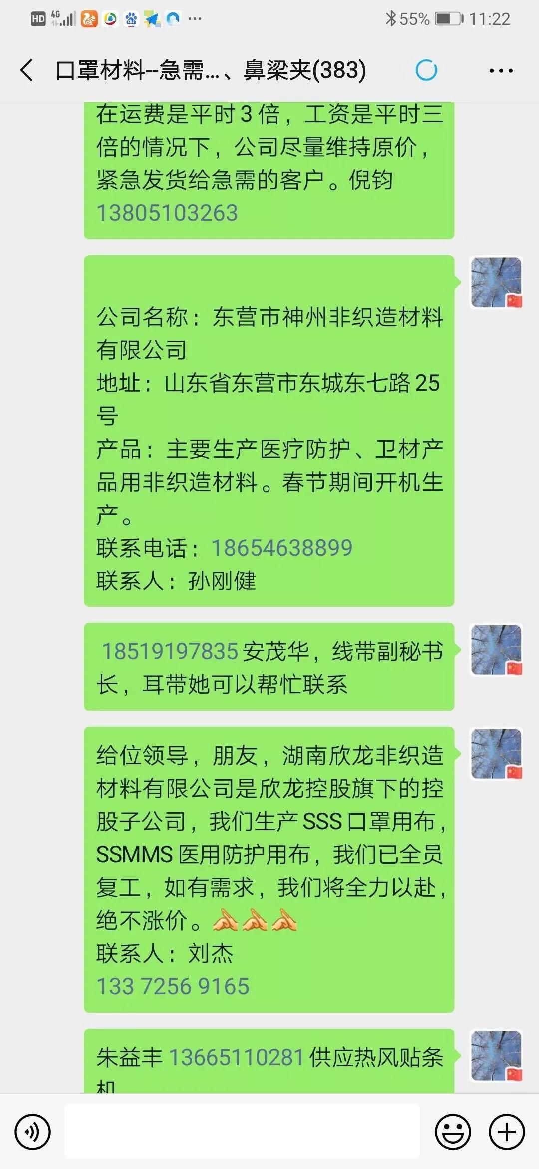 湖南欣龙非织造材料有限公司是欣龙控股旗下的控股子公司,我们生产SSS口罩用布,SSMMS医用防护用布,我们已全员复工,如有需求,我们将全力以赴,绝不涨价。联系人:刘杰133 7256 9165