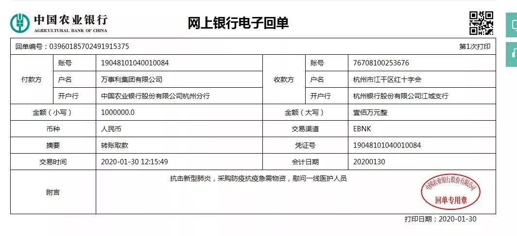 此外,万事利集团还通过由创始人沈爱琴设立的“爱宝基金”向江干区红十字会特别追加捐款100万元,专项用于支援新型冠状病毒感染肺炎的医疗救治及防控工作。