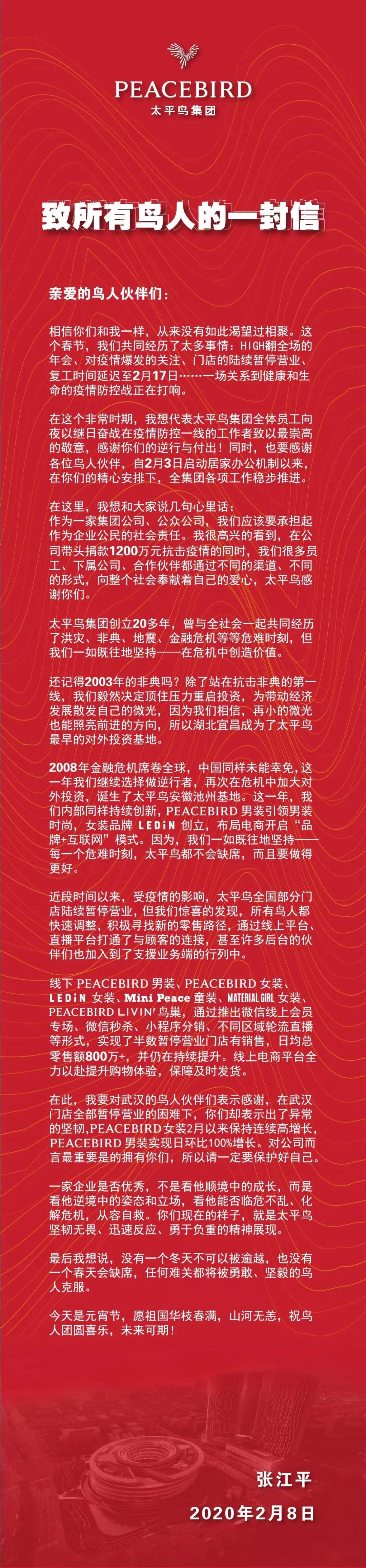 在此次公开信中,张江平对武汉的“鸟人”伙伴们表示感谢。“在武汉门店全部营停营业的困难下,你们却表示出了异常的坚韧,PEACEBIRD女装2月以来保持连续高增长。PEACEBIRD男装实现日环比100%增长,对公司而言最重爱是的拥有你们,所以请一定妥保护好目己。”