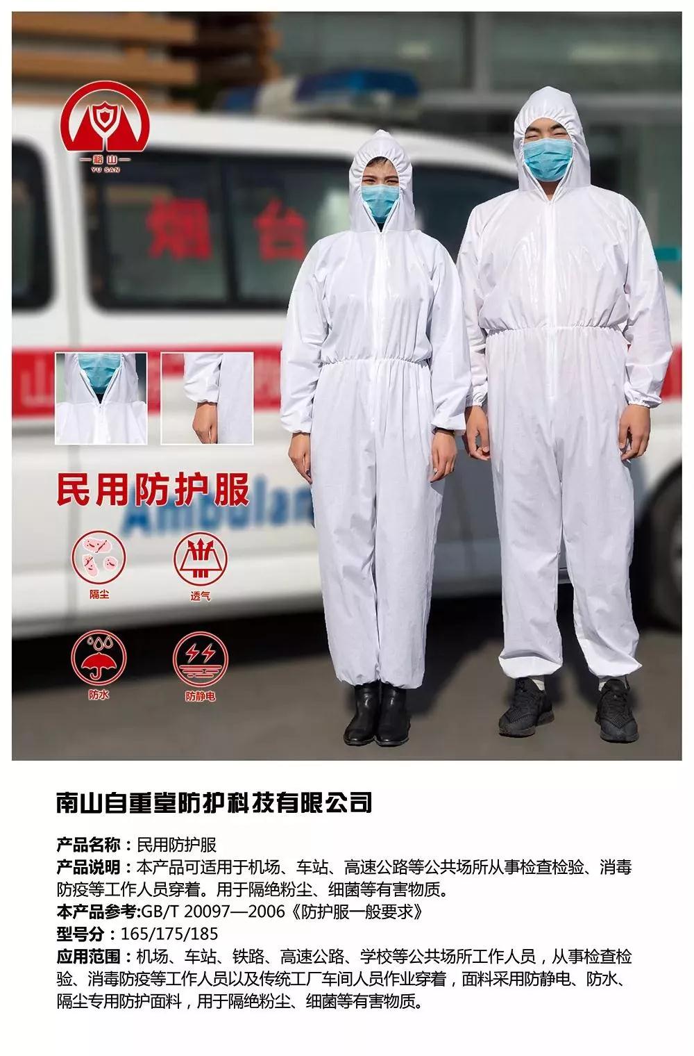 针对此次疫情,南山自重堂第一时间成立部署疫情防控小组,以党员领导为主体、抽调技术精湛、责任心强的员工,快速组成产品生产及质量督查突击队,实施一人一证进厂制度,统一配备测温仪器,对每日进厂员工进行严格的体温检测。在按市场监管局要求严把防护物资质量关的同时,快速完成防护用品生产线的扩容及改造,实现防护用品大规模量产,在保证安全的前提下,实施三班倒政策,做到人歇机不歇,目前产量2000套/天,预计本周末将达到5000套/天。目前公司供货量较大的产品主要为民用,其参考GB/T 20097—2006《防护服一般要求》标准,采用防静电、防水、隔尘专用防护面料,可有效隔绝粉尘、细菌等有害物质,是机场、车站、高速公路、工厂等公共场所从事检查检验、消毒防疫等工作人员的首选防护用品。