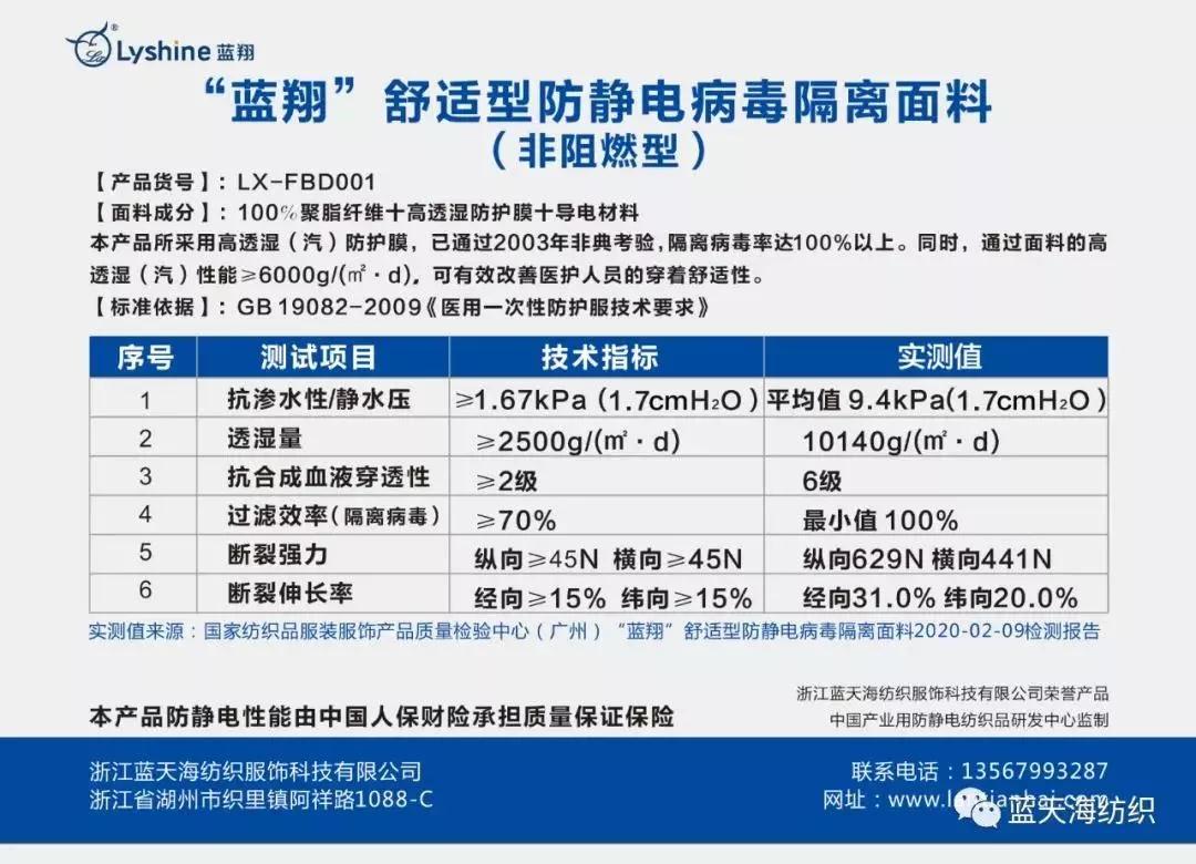 由于GB19082-2009标准《医用一次性防护服技术要求》中透湿量指标过低,穿着不透湿(透汽)容易闷,在一线战斗的医护人员脱下防护服后汗水都是浸湿衣裤的,为增加医护人员的穿着舒适性,“蓝翔”舒适型防静电病毒隔离面料透湿量高于医用一次性防护服标准的一倍,这将有效改善医护人员的穿着舒适性。同时“蓝翔”舒适型防静电病毒隔离面料具有防静电及防尘功能。“蓝翔”舒适型防静电病毒隔离面料通过国家纺织品服装服饰产品质量检验中心(广州)的检验检测,各项指标均符合并远超GB19082-2009《医用一次性防护服技术要求》标准。 | |