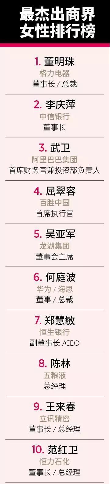 与往年相比,今年的榜单出现了许多新面孔,近1/4上榜者来自TMT行业,这其中包括被媒体称为“芯片女皇”的华为董事、海思总裁何庭波,排名第六。海思芯片目前是国内最大的半导体公司,全球芯片设计排名第五。此外,金融、房地产、医药行业上榜人数也较多。