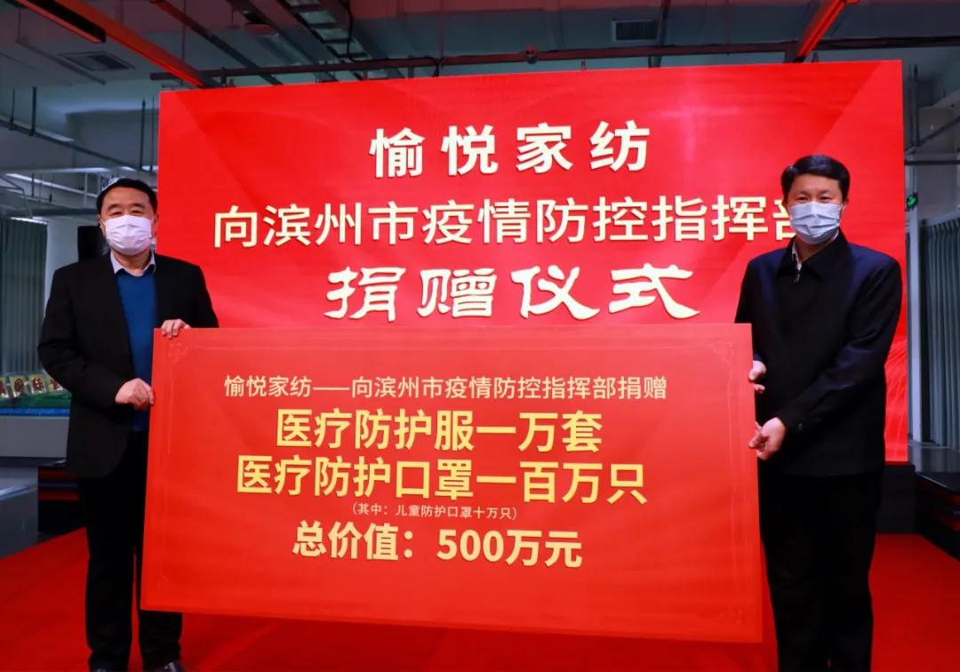 今后,愉悦的品牌将是一个融合了纺织家纺、医养健康、循环经济、电子信息、新材料等N多行业跨界融合的新物种,将是一个具有自我完善、生长能力的生命体。 2月26日上午,愉悦家纺有限公司向滨州市疫情防控指挥部捐赠价值500万元的防疫物资,强力支援全市的疫情防控工作。这批防疫物资包含1万套医用防护服和100万只防护口罩。 市委书记、市人大常委会主任佘春明出席捐赠仪式并致辞;市委常委、秘书长张延廷主持仪式;愉悦家纺党委书记、董事长刘曰兴代表公司捐赠防疫物资,市委常委、常务副市长张宝亮代表指挥部接受捐赠。 据悉,愉悦家纺捐赠的这批防疫物资包含1万套医用防护服和100万只防护口罩(含10万只儿童防护口罩)。相关产品全部产自公司旗下大健康产业的无菌制造车间,是地地道道的“滨州制造”、“愉悦生产”。 自疫情发生以来,愉悦家纺立足自身“家纺纺织”和“大健康”双产业链优势,开足马力增产、转产各类防疫物资,全力支援疫情防控。公司生产的医用防护服、防护口罩、无菌注射器、输液器、外科纱布敷料、医用脱脂棉、医用脱脂棉纱布等近二十种防疫物资,源源不断送往战疫前线,成为最美逆行者的“坚强护盾”,也为千家万户送去一份健康防护。 此外,在此次防疫狙击战中,愉悦家纺还贡献了一项革命性的“硬核”科技。公司攻关团队成功研发的“纳纤膜”新材料,利用纳米级的静电纺丝技术,实现了超高过滤和超低气阻完美融合,对细菌、病毒及各种颗粒物的过滤效果远超传统熔喷无纺布,不仅能广泛应用于防护服、口罩等医疗防护领域,在皮肤再生、生物传感、生物工程支架等生命健康领域同样前景广阔,有望掀起一场健康材料的革命。