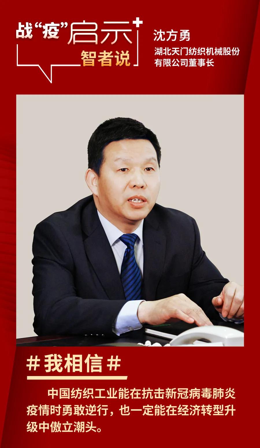 《中国纺织》:身处新冠肺炎爆发的重点地区,天门纺机第一时间如何应对? 沈方勇:我一直认为员工才是企业最大的财富,因此,在疫情发生后,我们首先确认的是有无员工感染,之后便开启了全员严格防控疫情的各种措施。在积极配合政府和社区进行人员管控的同时,公司还建立了联络机制,实行员工每日网上健康打卡,及时了解员工及家属健康状况,公司管理层与员工保持密切沟通,稳定员工情绪。值得庆幸的是,时至今日,天门纺机全体员工和家属没有没有一例新冠肺炎感染病例。 在全国上下齐心抗疫,共克时艰之时,作为一个有担当、有社会责任的企业,我们理应站出来,与社会各界共同战疫。为此,在1月27日,公司向天门市慈善总会定向捐资100万元,用于天门市定点收治新型冠状病毒感染的肺炎患者的医疗机构和战斗在防疫一线的工作人员采购口罩、护目镜、防护服等短缺医疗设备和防护物资。