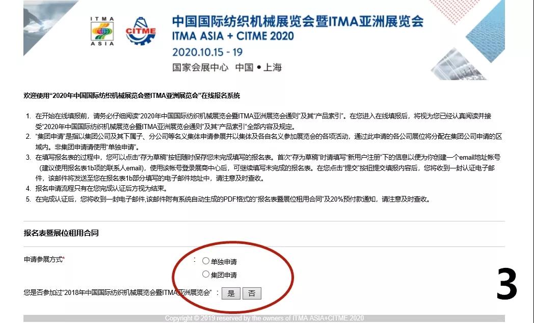 第三步 参展方式选择 “单独申请”(绝大多数企业以此报名) “集团申请”(集团内多家子企业分别参展,由集团母公司统一付款、安排报名等)