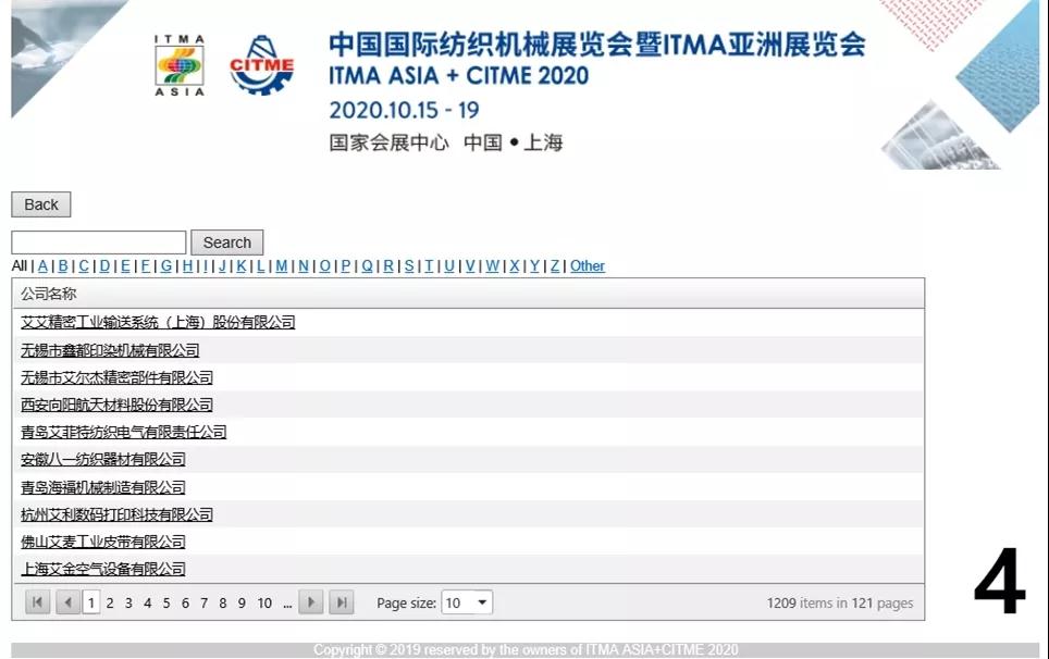 第四步 1、若参加过2018年展会,点击“是”,出现图4页面,从列表中选择公司名称(按2018年展会填写的参展企业名称首字母拼音排序),如图所示,在列表上方可进行公司名称检索。选择后,公司名称、地址等基本信息将自动填写。 2、未参加过2018 年展会,点击“否”,出现图5页面,填写相关信息。