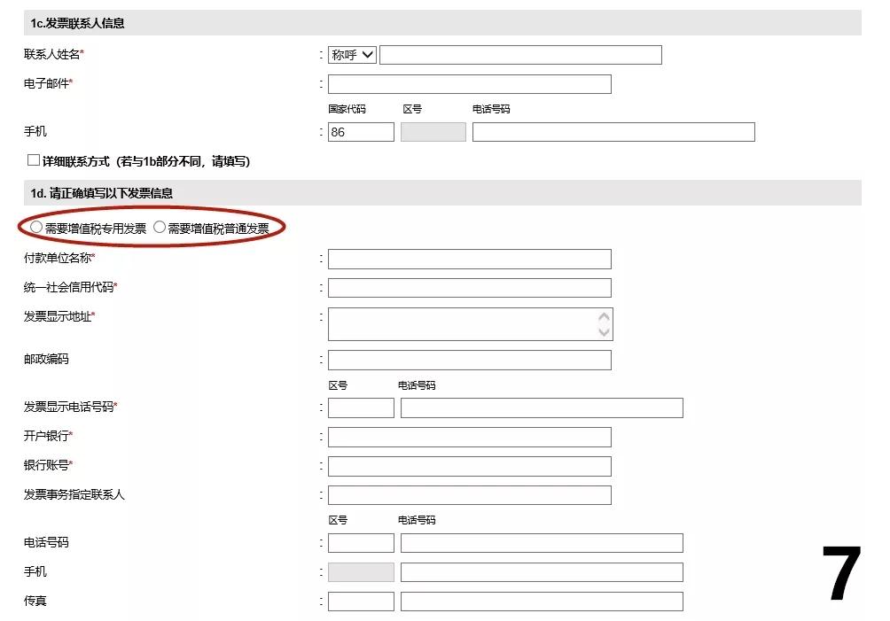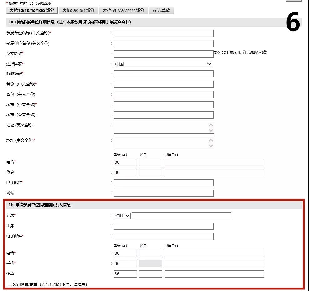 第五步 填写1a.参展单位详细信息及1b.展会联系人信息 注意:1b.中所填的邮箱地址是展会官方与您联系的重要联系方式,且此邮箱地址随后将作为登陆展商中心的账号。