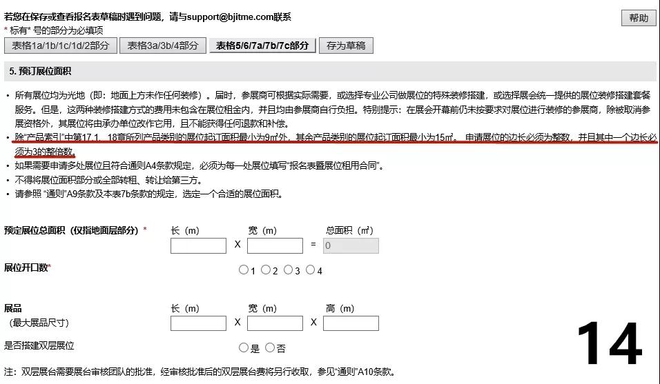 第九步 展会不设标准展位,除媒体和教育研究机构之外,最小起订面积为15㎡(光地),申请展位的边长必须为整数,且其中一个边长必须为3的整倍数。 所有事项填写完成后点击“继续填报”,会弹出图17所示对话框,点击“OK”后会出现完整申请表单。 如检查所填内容无误后,点击“提交”。