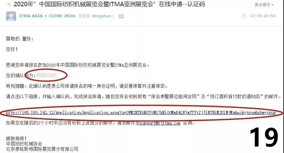 第十步 查看1b.联系人邮箱,点击系统自动发送邮件中链接,输入您的“确认码” 点击图20“提交”后再次查看您1b.所填邮箱。 【注】如未收到该邮件,可能被邮件服务器拦截。