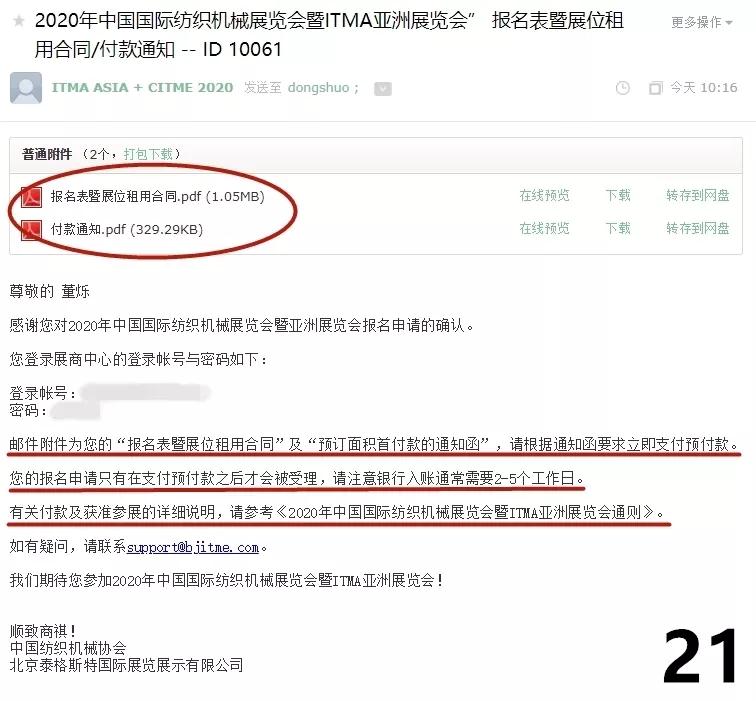 第十一步 确认码提交后,系统将再次给1b.联系人邮箱发送邮件,请登录查收“报名表暨展位租用合同”、“付款通知”及展商中心账号、密码(见图21),使用该账号可以登录报名系统中的展商中心查询、修改您的报名资料。 同时请安排支付20%预付款。