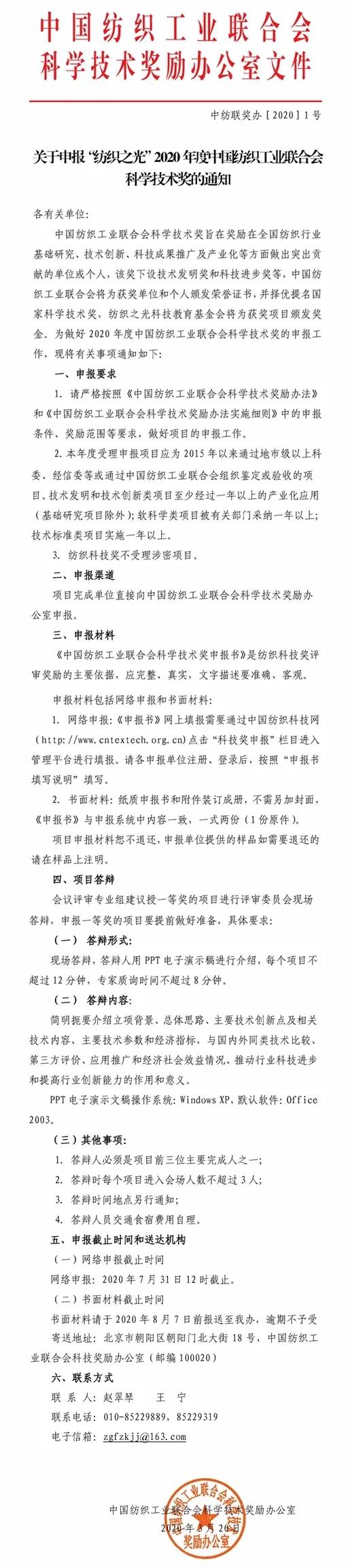 关于申报“纺织之光”2020年度中国纺织工业联合会科学技术奖的通知