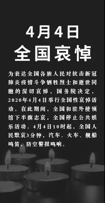 为表达全国各族人民对抗击新冠肺炎疫情斗争牺牲烈士和逝世同胞的深切哀悼,国务院决定,2020年4月4日举行全国性哀悼活动。在此期间,全国和驻外使领馆下半旗志哀,全国停止公共娱乐活动。4月4日10时起,全国人民默哀3分钟,汽车、火车、舰船鸣笛,防空警报鸣响。
