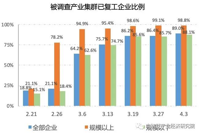 中纺联群办、园区办对全国13个省份的28个重点纺织产业集群进行了调查,截至4月3日12时,上述集群共有6.8万户纺织企业复工生产,占集群企业总数的89%,较一周前调查数据提高2.6个百分点;已复工人数达到218.4万人,占正常用工人数的86%,较一周前调查数据提高10个百分点。其中,集群内3939户规模以上企业中,已复工企业比例为98.8%,已复工人员比例达90.2%。被调查小微企业复工复产形势保持平稳。28个重点产业集群共有6.4万户规模以下企业实现复工,占集群规下企业总数的比例为88.1%,较一周前调查数据提高2.4个百分点;规下企业已复工人数达到117.9万人,占正常用工人数82.5%,较一周前调查数据提高11.3个百分点。