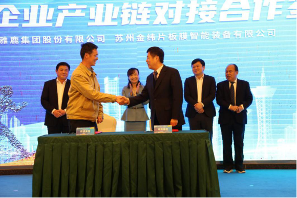 雅鹿集团顾振华(右)与苏州金纬机械何海潮(左)完成项目签约