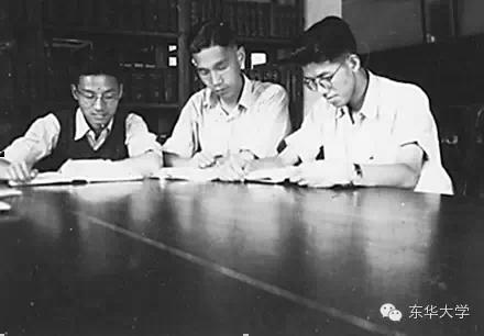 ▲1948年,郁铭芳(中)与大学同学于文潮(左)、郎庆海(右)在上海圣约翰大学图书馆学习