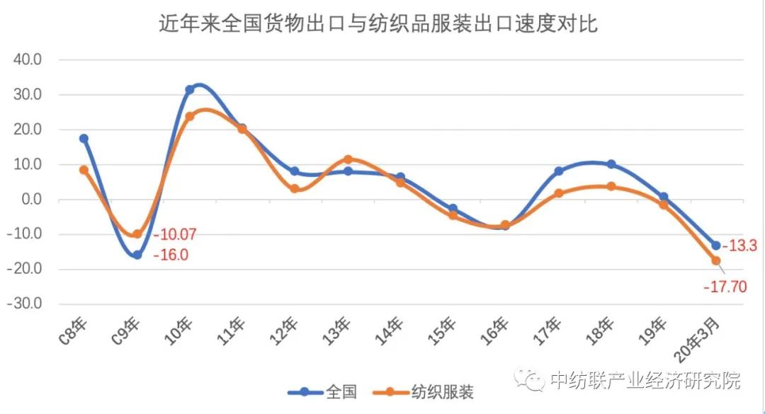 | 一季度纺织服装出口降幅加深 | | 作者:中国纺织 时间:2020-04-20 评论(0) | | 据海关总署4月14日发布数据显示,受新冠肺炎疫情影响,2020年一季度全国货物对外贸易整体下滑,按美元计,全国外贸进出口9432.2亿美元,同比下降8.4%,其中出口下降13.3%,进口下降2.9%。2020年一季度,我国纺织品服装累计出口金额452.6亿美元,比上年同期下降17.7%,其中,纺织品出口226.9亿美元,同比下降14.6%;服装出口225.7亿美元,同比下降20.6%。从历年纺织品服装出口来看,受新冠肺炎疫情影响,现阶段我国纺织品服装出口降幅水平甚至超过了金融危机发生后的2009年。据统计,2009年全国货物出口降幅为16.0%,纺织品服装出口降幅为10.07%;而2020年一季度,全国货物出口降幅为13.3%,纺织品服装出口降幅加深到17.70%。 进入2020年,新冠肺炎疫情持续蔓延,全球消费需求下滑,且对可选消费品的需求受到更为明显的抑制,美欧市场部分客户取消或推迟对我纺织品服装进口订单,导致我国纺织品服装出口在一季度的降幅高于整体货物贸易出口,其中服装出口降幅超过纺织品出口,且在出口产品结构中,首次呈现服装出口规模低于纺织品出口规模的特点。 | |