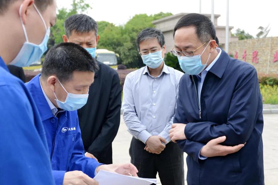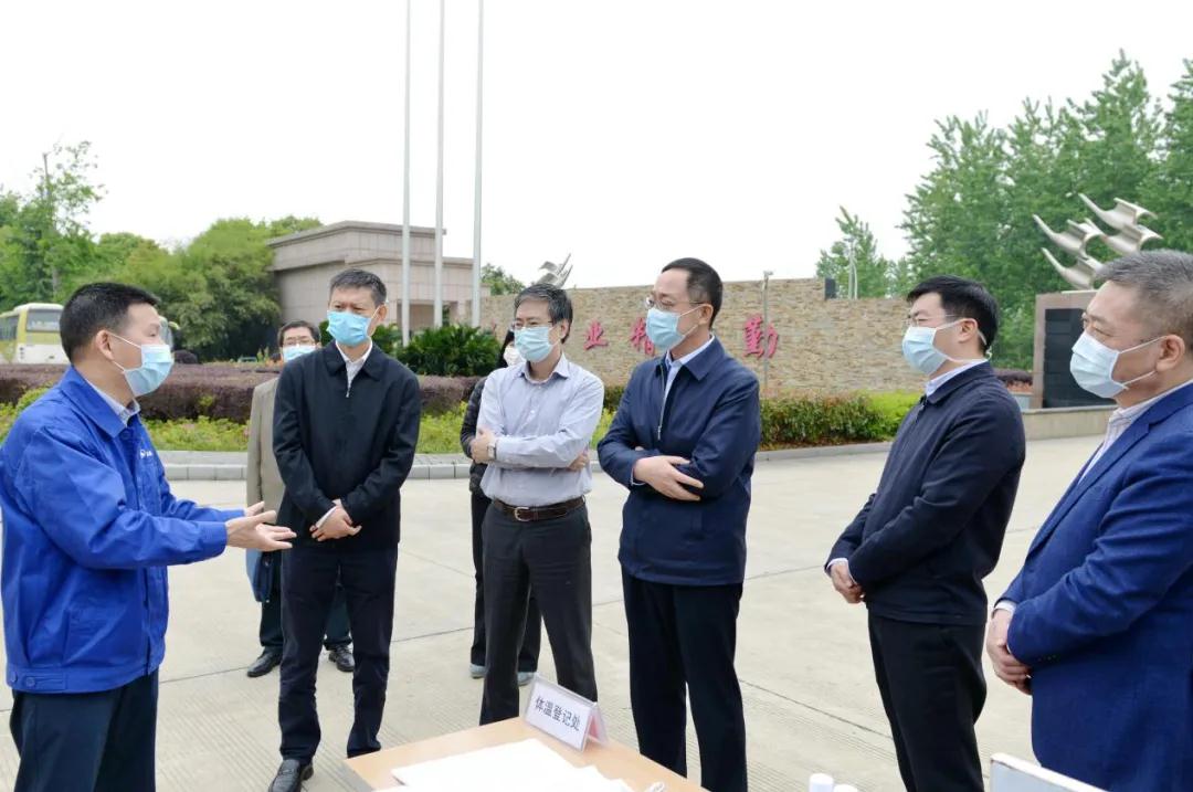 国家卫健委副主任于学军(右3)、国家卫健委卫生应急办公室监察专员张国新(左3)、湖北省卫健委副主任涂远超(右1)、天门市委书记庄光明(左2)、天门市委副书记代理市长杨兴铭(右2)听取天门纺机董事长沈方勇(左1)工作汇报