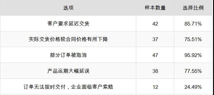 在受调研的49家企业里,与去年同期相比,不光近七成企业当前产品价格或加工费出现不同程度的下降,其中降低10%-30%的企业最多,订单还出现了大幅度下降。其中,24.49%的企业内销订单只有去年同期水平的30%-50%,63.28%的企业认为下月内销订单会有不同程度的降低;30.61%的企业外销订单仅达到去年同期水平的10%-30%,甚至超七成企业本月订单出现下降。此外,95.92%的外贸企业面临着部分订单被取消的危机,85.71%遇到了客户要求延迟交货的问题,77.55%和75.51%还都存在产品运期大幅延误和实际交货价格较合同价格有所下降等问题,给企业造成了严重的经济损失,其中直接经济损失在1000万元及以上的企业占比最高,为55.32%。