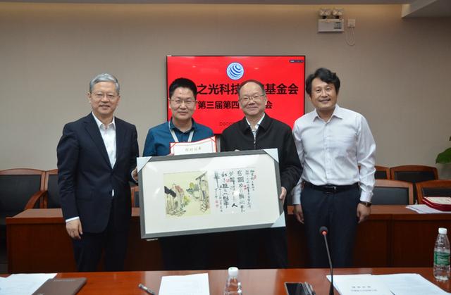 ▲高勇、夏令敏向郭宏钧颁发捐赠证书,郑国峰赠送自创画作。