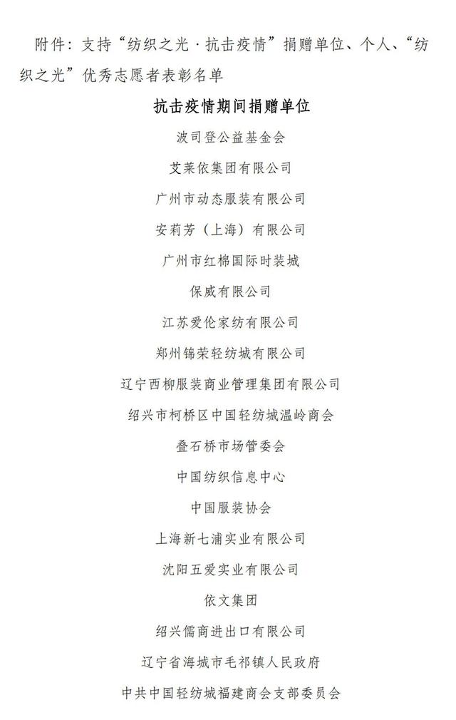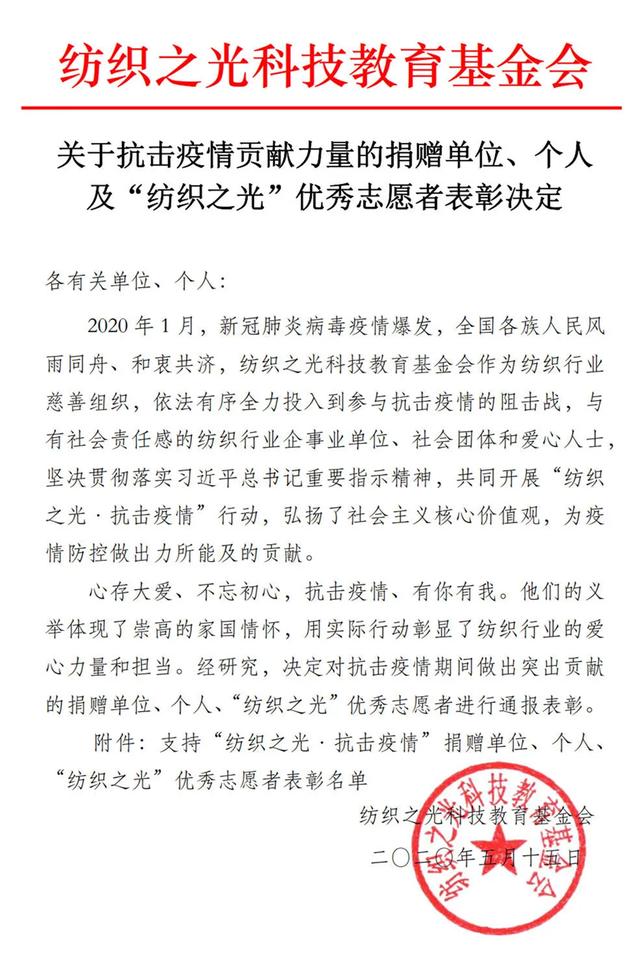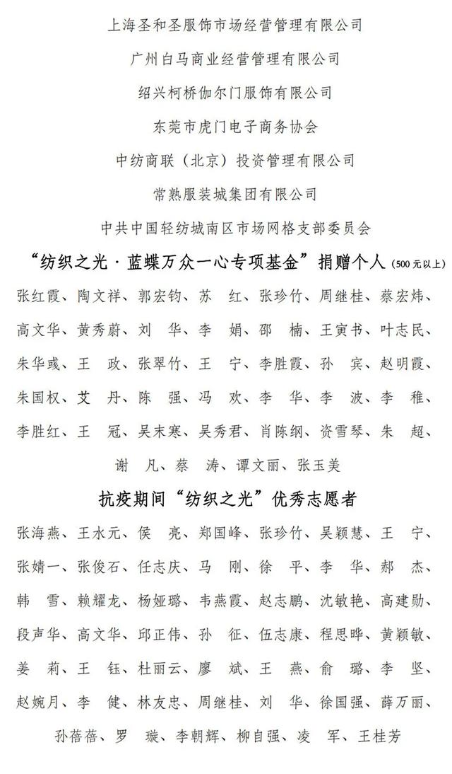 会议还对抗击疫情期间的“纺织之光·蓝蝶万众一心专项基金”捐赠人、“纺织之光”优秀志愿者进行了表彰。