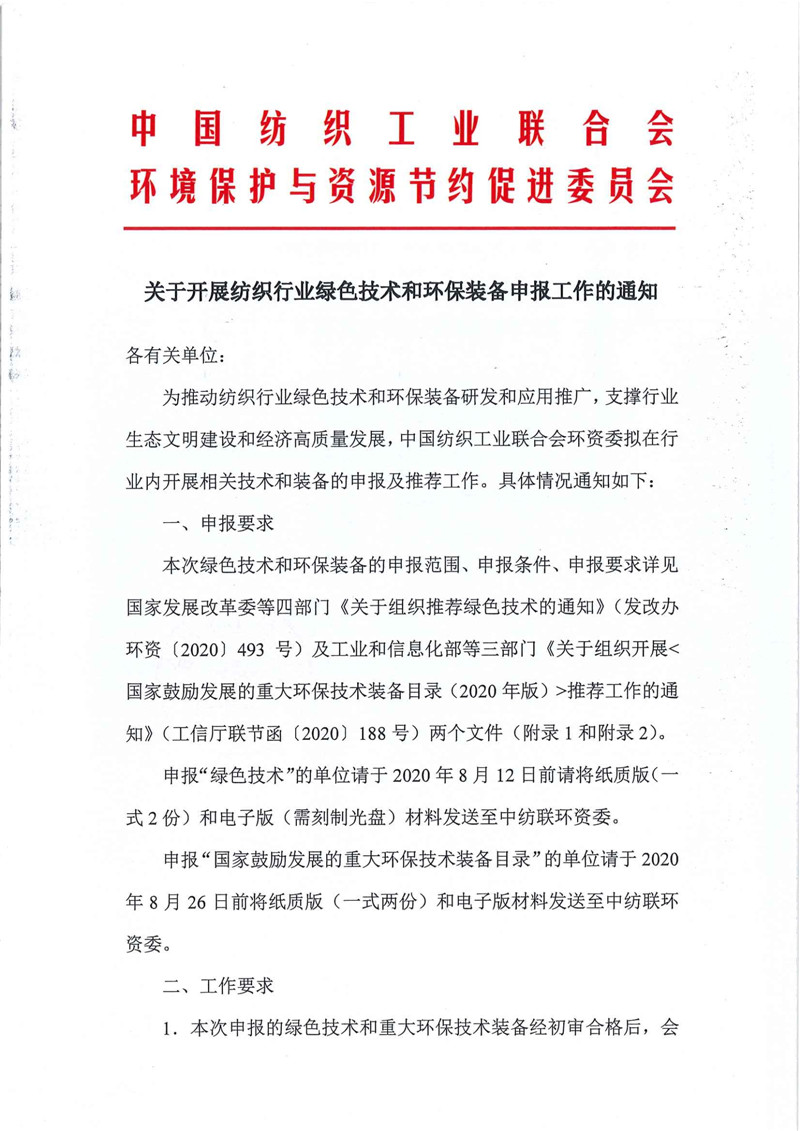 为推动纺织行业绿色技术和环保装备研发和应用推广,支撑行业生态文明建设和经济高质量发展,中国纺织工业联合会环资委拟在行业内开展相关技术和装备的申报及推荐工作。具体情况通知如下: