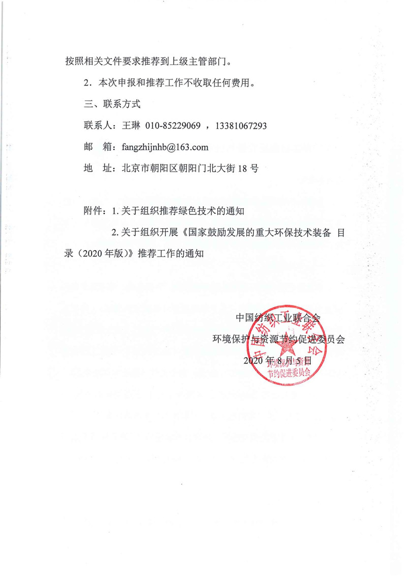 申报“国家鼓励发展的重大环保技术装备目录”的单位请于2020年8月26日前将纸质版(一式两份)和电子版材料发送至中纺联环资委。