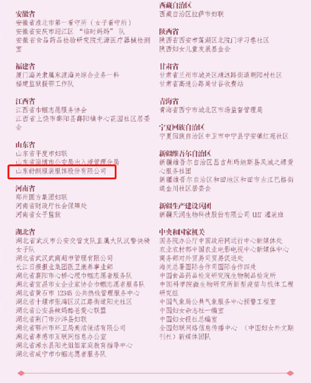 2020年9月29日,抗击新冠肺炎疫情全国三八红旗手(集体)表彰云发布活动上,山东舒朗服装服饰有限公司获得“全国三八红旗集体”荣誉称号。
