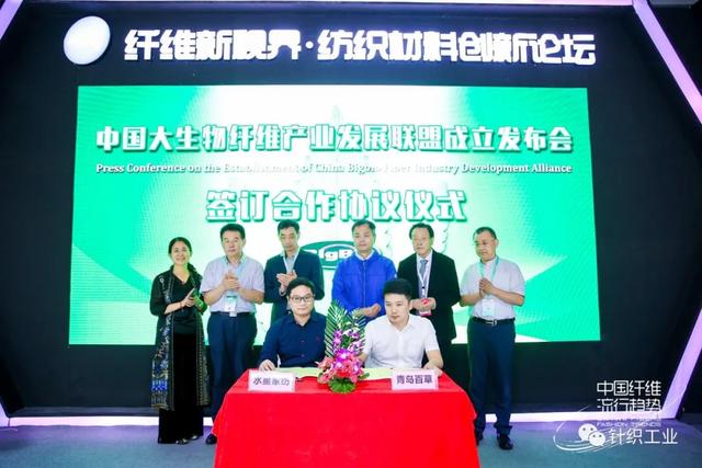 授牌仪式结束后,青岛百草新材料股份有限公司总经理王丙伟与上海水星家用纺织品股份有限公司、浙江华欣新材料股份有限公司、上海英伦宝贝儿童用品有限公司的代表签订友好合作协议。