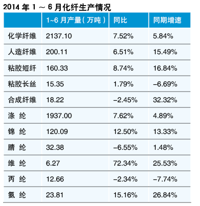 2014年1~6月化纤产量2137万吨,同比增长7.52%。产量增速逐月提高,从1~2月份的0.86%提高到1~6月份的7.52%,超过去年同期增速1.68个百分点。协会表示这一数据说明市场需求在逐渐恢复。