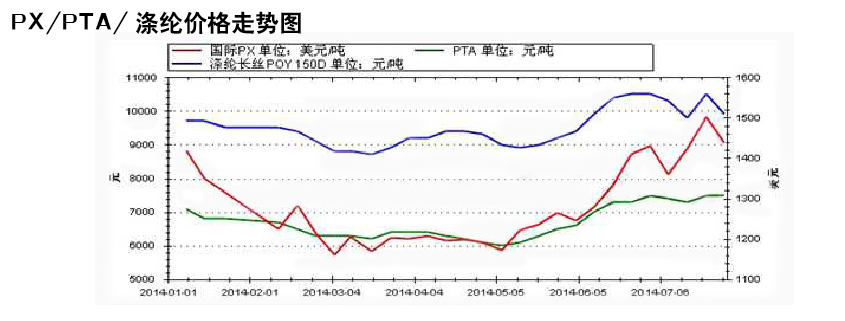 1、2月份,由于聚酯工厂停产较多,PTA价格持续下滑,PX供应面充足,价格也跟随PTA下跌。3月下半月开始,下游需求回暖带动涤纶价格回升,原料价格也探底企稳,但是难改下行趋势。4、5月份,PTA新产能集中释放,市场价格快速下跌。5月中上旬,市场迅速反转。PX强势反弹,PTA在成本压力下不得不上调价格,但涨幅不及PX。5月底,PTA工厂限产报价并改变结算价模式以成本定价,聚酯产品被动跟涨,但下游逐渐进入淡季跟涨力度不足。