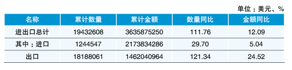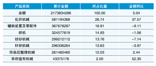 从进口产品类别看,化纤机械进口排在第一位。进口总额为5.81亿美元,同比增长37.57%,化纤机械进口额占进口总额的26.74%,具体情况如下图表所示。