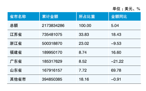 2014年1~6月,全国31个省市自治区中,有30个省市有不同数量的进口。江苏省、浙江省、福建省广东省和山东省位列进口总额的前五位,占进口总额的81.84%。江苏省进口总额排在第一位为7.35亿美元,同比增长18.43%,占比为33.83%;其中上海市、重庆市、吉林省、浙江省、广东省、河北省、天津市、黑龙江省、江西省、湖北省、河南省、四川省、北京市、海南省、贵州等省的同比跌幅高于平均水平。下表反映了进口纺机前五位省市情况: