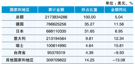 2014年1~6月,纺织机械进口的主要国家和地区以德国、日本、意大利、瑞士和台湾省为主,进口前五位国家和地区的贸易总额为18.64亿美元,同比增长8.81%,占进口总额的85.75%,主要情况如下图表所示。