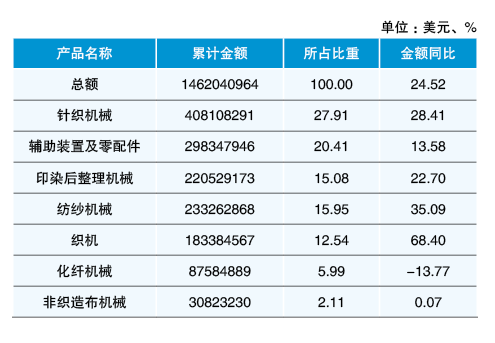 针织机械出口额为4.08亿美元,同比增长28.41%,占比27.91%,位居第一,依次为辅助装置及零配件、印染后整理机械、纺纱机械、织机、化纤机械、非织造布机械,只有化纤机械是负增长。