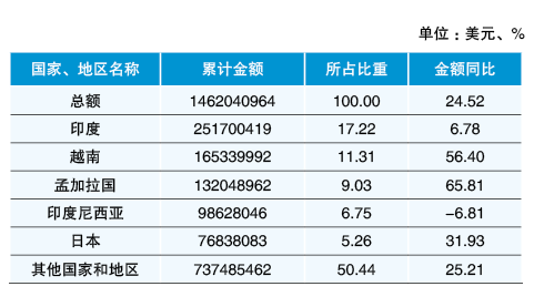 2014年1~6月,我国共向170个国家和地区出口纺织机械产品,出口金额前五位的国家和地区如下表所示。