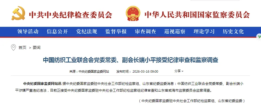中国纺织工业联合会党委常委、副会长端小平涉嫌严重违纪违法,目前正接受中央纪委国家监委驻中央社会工作部纪检监察组纪律审查和山东省威海市监察委员会监察调查。