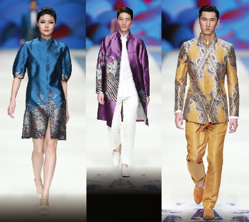 中国宫廷服饰图案具有很高的艺术价值。服装图案上的构成元素与艺术表现手法都是中华民族整个时代艺术文化的高层审美观的外在体现;服饰图案是人们记录生活经验和表达审美意识及寄托精神、信仰的特殊语言,是传承历史和文明的重要载体。本季曾凤飞从故宫的珍贵资料中汲取了很多设计灵感,除了注意传承中国宫廷服饰的尊贵大气,他更以一个现代设计师的角度从服装的款式、轮廓、线条、图腾各个角度,让传统文化更显现代、时尚、潮流; 曾凤飞2015春夏发布会系列对宫廷典型的十二章纹样、龙纹、水纹、云纹、边缘纹样、吉祥纹样、补服纹样等从构成、色彩、布局等方面进行重组设计。如“正龙”、“行龙”、“团龙”等各式龙纹纹样;通过织、绣,配上镶、嵌边等手段,形成不同的视觉效果。而服装下摆处 “海水江涯”“立水纹”、“平水纹”,采用古典的晕色手法。图案经过重新设计后,运用于廓型简洁利落的服装,节奏感十分强烈。纯色嵌边修身长、短裤简约而干练,使整体奢华又极具现代感。面料的运用上以传统的高级面料宋锦、丝缎为主,突出华贵大方,辅以曾凤飞引以为豪的精细工艺,让本季曾氏中式服装再次带来令人耳目一新的感受。 |