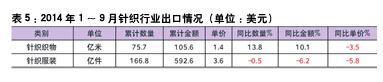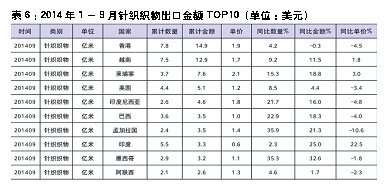 从第三季度的行业进出口数据看,在纺织原料形势颇不理想的情况下,针织织物出口累计数量达75.7亿米,累计金额105.6亿美元,数量同比上升13.8%,金额同比上升10.1%,单价同比下降3.5%;针织服装出口累计数量达166.8亿件,累计金额592.6亿美元,数量同比下降0.5%,金额同比下降6.2%,单价同比下降5.8%。虽从数据看,两板块小幅下降,但情况好于预期,主要受到越南等不稳定市场、以及东盟各国成本优势竞争的影响,出口单价受到挤压(见表5所示)。