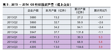 2014第三季度针织服装板块继续保持累计同比正增长,增幅3.9,较上季度有所下降,累计产量达到104.6亿件。参照针织服装板块在出口数据中的表现(数量同比-0.5%),可以看到内销市场对针织服装需求的提升。