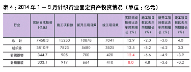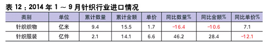 针织行业整体看,出口好于预期,根据前三季度数据预测,全年仍可突破千亿美元大关。其中从针织织物的进出口数据可以看出,其在国内国际市场的竞争优势增强,在成本上升的压力下,有逐步替代进口之势。规上企业产量继续保持进入2014年以来的微弱同比正增长,但本季度增幅有所减弱。行业投资下滑比较明显,对新一年的增长将形成一定影响。从进口及网络销售数据显示,在内销市场整体动力不足的情况下,针织服装相对保持稳定。