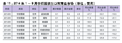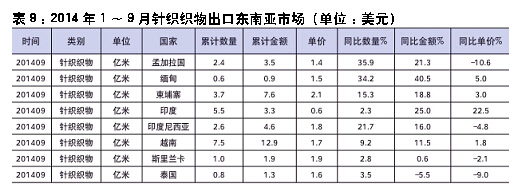 随着发达国家的重新布局,及中国企业的跨国资源配置不断深入,东南亚市场成为我们跟踪分析的重点市场,在选取的孟加拉、缅甸、柬埔寨、印度、印尼、越南、斯里兰卡、泰国八个国家中,孟加拉、缅甸、印尼在针织织物板块的数量增长突出,均超过百分之二十,同时,可以看到孟加拉和泰国的单价均下跌约十个百分点(如表9所示)。