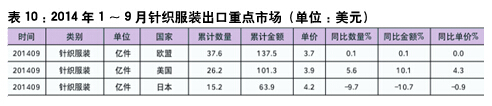 在对针织服装板块中欧、美、日三大重点市场分析中可以看到:欧、美数量、单价均有小幅上升,反映了其国内经济的稳步复苏状态,而日本出口数量和出口金额均有约百分之十的下降,可见其国内消费回暖仍需期待(如表10所示)。