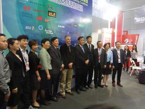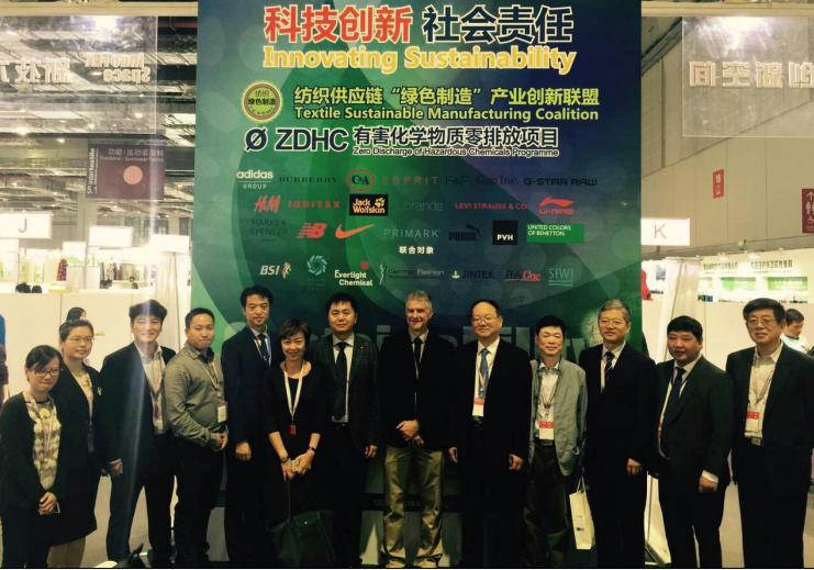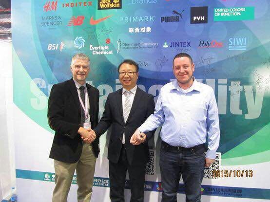 为了在行业推进“以科技创新驱动绿色制造,加强社会责任实现可持续”的发展理念,让更多的企业在转型升级的过程中发贯彻并融合“科技创新 社会责任”的内涵,10月13日,值此中国国际纺织面料及辅料(秋冬)博览会、中国国际服装服饰博览会 2015(秋季)、中国国际针织(秋冬)博览会和中国国际纺织纱线(秋冬)展览会四展同时在上海举行之际,纺织之光科技教育基金会、中纺联社会责任办公室、中纺联科技部以及ZDHC有害化学物质零排放集团共同举办了“纺织绿色制造联盟”系列展会活动,得到了众多参展企业的响应和的一致好评。  特别是活动期间,中国纺织工业联合会会长王天凯,副会长兼秘书长高勇,副会长孙瑞哲、徐文英、杨纪朝、夏令敏,党委副书记陈伟康等行业领导齐聚5.1H K36新技术创新空间。在仔细聆听和了解本次活动宗旨和理念后,领导们与ZDHC全球技术总监Scott Echols、C&A全球可持续化学采购负责人Adam及Adidas、ZARA等国际品牌代表一起签名,纷纷为行业绿色制造点赞。
