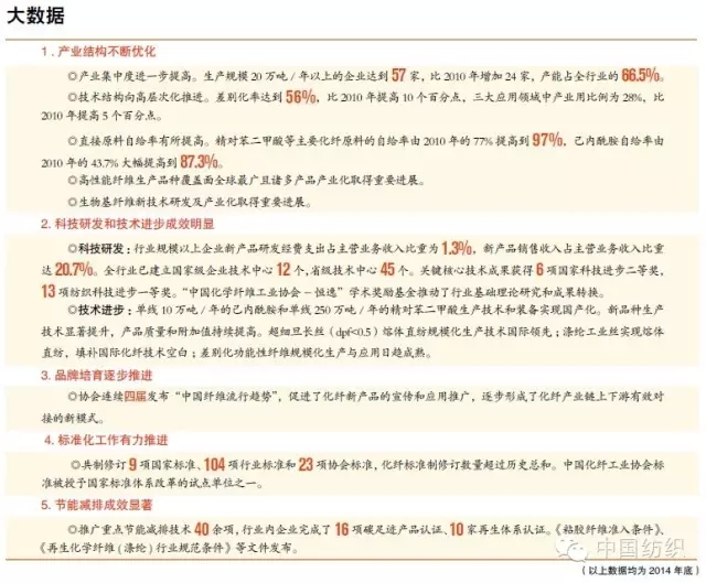 这五年,是纺织工业发生变革的五年。“结构调整、增质提效、创新驱动”已经成为行业发展的重要动力。这五年,化纤工业依靠拼装备、规模、产量、成本的时代已经过去;五年间,棉花质量、进口纱冲击等因素对中国棉纺行业的世界竞争力造成了较大影响;这五年,中国纺机制造水平有了明显提升,国产纺机出口第一次超过进口;五年间,印染行业实现了科技进步与节能环保实现均衡发展;这五年,针织行业出口额占到全国纺织服装出口的1/3,全球纺织服装贸易总额的12%;五年间,产业用纺织品应用领域更加多元化,在整个纺织工业的占比已经超过25%;这五年,毛纺行业加快了向文化创意、设计、品牌等高价值产业链延伸的步伐;五年间,麻纺行业发展势头强劲,时尚麻纺、绿色麻纺生活理念不断深入人心;这五年,家纺行业品牌建设成效显著,跨界合作不断推进,行业国际化进程不断加快……